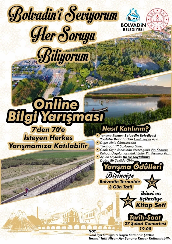 7'den 70'e herkesin katılabileceği online bilgi yarışmamız, Bolvadin belediyesi You Tube sayfasından 27 Şubat Cumartesi günü saat 19.00'da başlayacaktır.