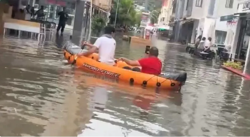 "Bot görüyorsunuz şu anda. Bot sokakta yüzüyor. Fethiye'de son durum bu şekilde Fethiye'nin işlek caddesinde vatandaş botla yüzüyor. Belime kadar su olmuş durumda.