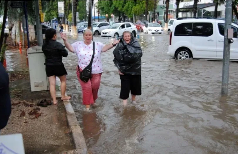 Yayına sanırım yüzerek devam edeceğim. Venedik olmuş. Fethiye değil sanki Venedik olmuş. İnsanların suyun içinde ilerlemeye çalışıyor.