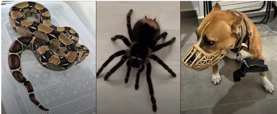Burdur’da jandarma ekipleri tarafından bir eve gerçekleştirilen operasyonlarda burma pitonu, kırmızı kuyruklu boa yılanı, tarantula örümcek, kertenkele ve pitbull köpeği ele geçirildi.