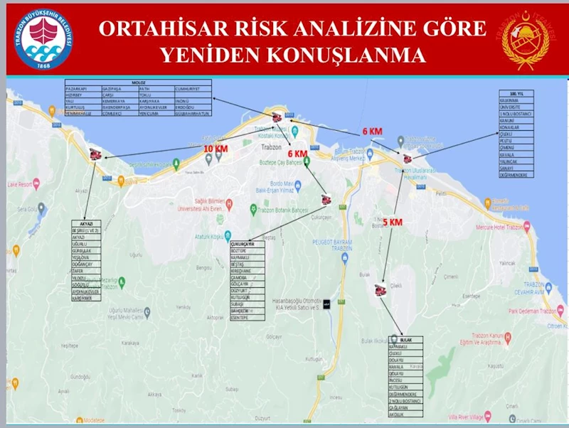 “İtfaiye istasyonlarının sayısı, yer seçimi ve olay istatistikleri doğrultusunda mevcut kapasitesinin değerlendirilmesine yönelik olarak ise 2022 yılında KTÜ Endüstri Mühendisliği ile bir proje geliştirilerek önce Ortahisar sonra Akçaabat’ı da içine alacak şekilde olayların yoğunlaştığı mahalleler, olay türleri, yol durumu, bina ve tesislerin tehlike sınıfına göre bir risk değerlendirmesi yapılmıştır. Yapılan çalışmada, Derecik Mahallesi veya civarındaki bölgelerde bir itfaiye istasyonu kurulması ihtiyacı tespit edilmemiştir. Söz konusu bölgeyi de kapsayan tüm mahallelerde meydana gelen itfaiye olaylarını geriye dönük olarak bir yıllık incelediğimizde toplamda 62 adet yangın çıktığı bunun 36 adedinin açık alan yani bahçe ateşi yakma şeklinde gerçekleştiği 13 adedinin küçük çaptaki mesken yangını olduğu geriye kalan olayların ise trafik kazası ve asılsız ihbarlar olduğu belirlenmiştir.”