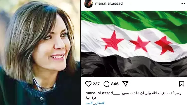 Mahir Esad’ın eşi Manal Esad sosyal medya hesabından Suriye’nin yeni bayrağını, “Aile ve vatan satıcılarına rağmen, yaşasın özgür ve gururlu Suriye” notuyla paylaştı.
