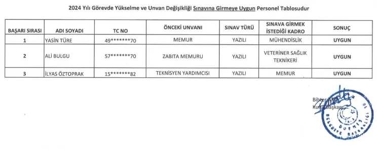Görevde Yükselme ve Unvan Değişikliği Sınavına Girmeye Uygun Personel İlanı