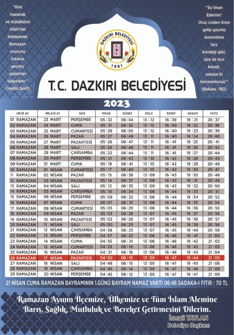 Her sene olduğu gibi bu sene de Ramazan Ayı öncesi imsakiyelerimizi bütün hemşehrilerimize ulaştırmaya çalıştık. Belediye Başkanımız İsmail Taylan ramazan ayı için yayımladığı mesajında “Yarından itibaren idrak edeceğimiz mübarek Ramazan Ayının güzelliklere vesile olmasını, tutacak olduğumuz oruçların rabbimin katında kabul olmasını diliyorum” dedi.