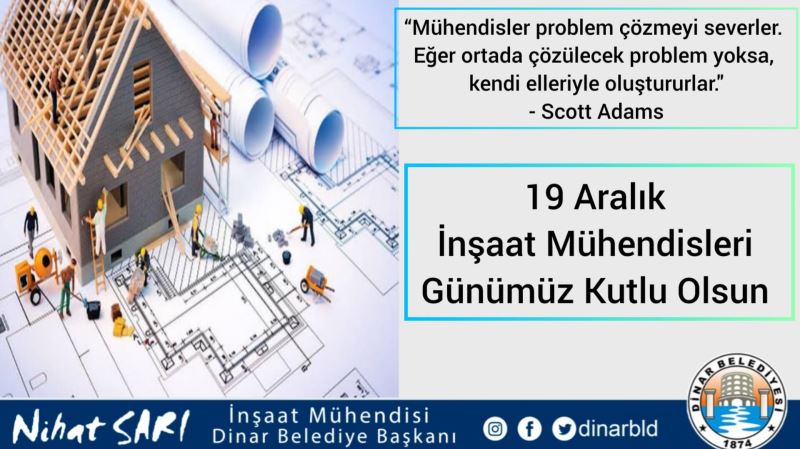 Dinar Belediye Başkanımız Nihat Sarı, 19 Aralık İnşaat Mühendisleri Günü dolayısıyla bir mesaj yayımladı.