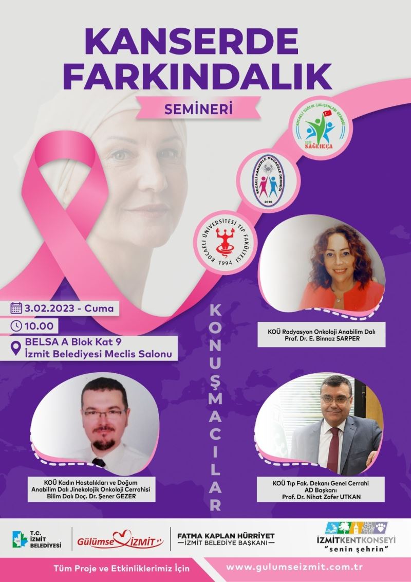İzmit Belediyesi, İzmit Kent Konseyi, Kocaeli Üniversitesi, Kocaeli Sağlık Çalışanları Derneği ve Kocaeli Kanserle Mücadele Derneği iş birliğinde 3 Şubat Cuma günü İzmit Belediyesi Meclis Salon’unda “Kanserde Farkındalık ” semineri düzenlenecek