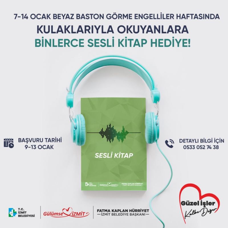 Engelli dostu İzmit Belediyesi, projeleri ile engelli bireylerin yanında olmaya devam ediyor. İzmit Belediyesi, 7-14 Ocak Beyaz Baston Görme Engelliler Haftası kapsamında görme engelli vatandaşlara sesli kitap uygulaması hediye kodu armağan edecek.
