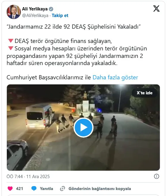 İçişleri Bakanı Yerlikaya, sosyal medya hesabından yaptığı paylaşımda, Türkiye’nin her bölgesinde huzuru ve istikrarı sağlamak için yılın 365 günü, gece gündüz yürütülen operasyonlara devam edildiğini belirterek, şu ifadelere yer verdi; "DEAŞ terör örgütüne finans sağlayan, sosyal medya hesapları üzerinden terör örgütünün propagandasını yapan 92 şüpheliyi Jandarmamızın 2 haftadır süren operasyonlarında yakaladık. Cumhuriyet Başsavcılıklarımız ile Jandarma Genel Komutanlığı TEM Daire Başkanlığımız koordinesinde; İl Jandarma Komutanlıklarınca, Adana, Aksaray, Antalya, Bursa, Çanakkale, Çankırı, Diyarbakır, Gaziantep, Hatay, İstanbul, İzmir, Kayseri, Kırıkkale, Kırşehir, Kocaeli, Konya, Malatya, Mersin, Osmaniye, Siirt, Tekirdağ ve Yozgat olmak üzere toplam 22 ilde son 2 haftada operasyonlar gerçekleştirildi."