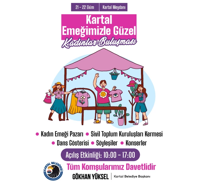 Kartal Meydanı’nda 10.00-17.00 saatleri arasında gerçekleştirilecek olan ‘Kartal Emeğimizle Güzel-Kadınlar Buluşması’na tüm komşularımız davetlidir.