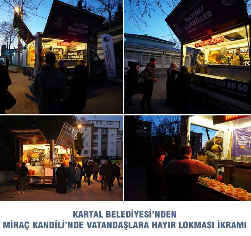 Kartal bulunan Mehmet Akif Cami, Çavuşoğlu Cami, Kıbrıs Şehitleri Cami ve Şeyh Edebali Cami önünde pişirilen sıcak lokmalar, mobil ikram araçlarından cami cemaatine ve vatandaşlara ikram edildi. Lokma dağıtımı yapan ekipler, Kartal Belediye Başkanı Gökhan Yüksel'in vatandaşlara selamlarını ileterek, kandillerini kutladı.
