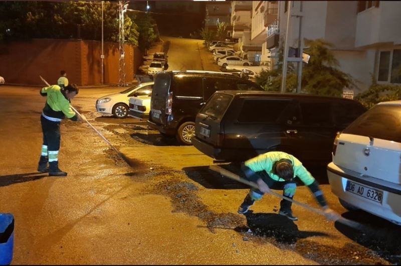 Keçiören Belediyesi, ilçede yaşanan sağanak yağış sonrası cadde ve sokaklarda oluşan kum, çamur ve diğer atıkların oluşturduğu birikintileri temizlemek için gece boyunca aralıksız çalışma yürüttü.