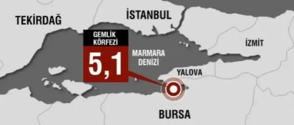 Marmara Denizi, Gemlik Körfezi'nde 5.1 ve 4.5 büyüklüğünde iki deprem gerçekleşti. Depremler, İstanbul, Kocaeli, Bursa, Sakarya, Yalova, Çanakkale ve birçok şehirde hissedildi. İçişleri Bakanı Ali Yerlikaya, "Başta AFAD olmak üzere ilgili kurumlarımızın tüm ekipleri saha tarama çalışmaları için bölgeye sevk edilmiştir" ifadelerini kullandı. CNN TÜRK'e konuşan Mudanya Belediye Başkanı Hayri Türkyılmaz, "Şu anda özellikle 99 depremi öncesi yapılan binalarda durulmamasını tavsiye ediyorum, dikkatli olmaları gerekiyor. Zorunluluk olmadıkça da evde kalmasınlar." çağrısında bulundu. Prof. Dr. Naci Görür depremin meydana geldiği noktaya dikkat çekti. Görür, '1999 depremlerinde tahmin ediyorum stres kaybına uğradı. Bu kentimizin yeri çok tehlikelidir ve doğrudan Gemlik fayının üzerindedir.' dedi.
