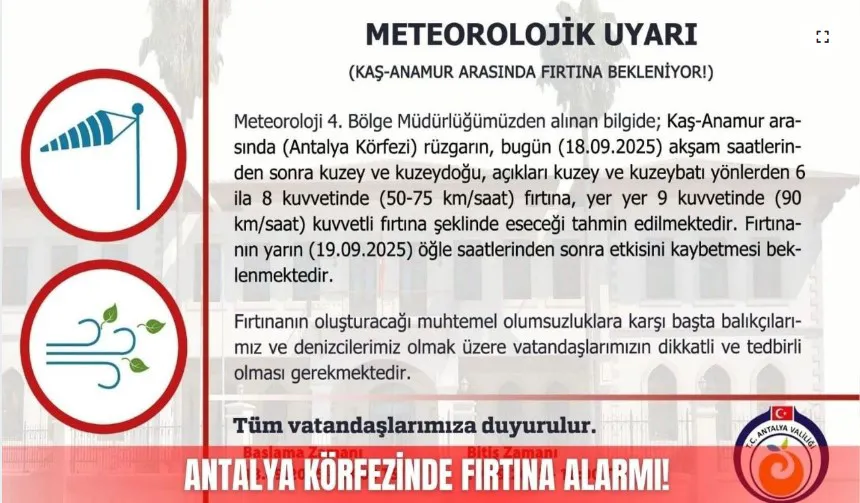 Meteoroloji 4. Bölge Müdürlüğü, Antalya açıklarında etkili olması beklenen fırtına nedeniyle vatandaşları uyardı. Yapılan açıklamaya göre, Bodrum-Kaş ve Kaş-Anamur arasında rüzgâr, bugün (18 Eylül 2025) akşam saatlerinden itibaren kuzey ve kuzeydoğu yönlerinden 6 ila 8 kuvvetinde (50-75 km/saat) fırtına, yer yer ise 9 kuvvetinde (90 km/saat) kuvvetli fırtına şeklinde esecek.