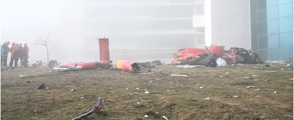 Sabah saatlerinde Antalya'ya gitmek için tekrar havalanan ambulans helikopter, kalkıştan kısa bir süre sonra yoğun sis nedeniyle hastane binasına çarparak kaza kırıma uğradı.