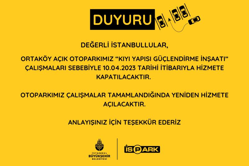 İstanbul Büyükşehir Belediyesi (İBB) iştiraki İspark’ın Ortaköy’de bulunan otoparkının denize paralel bölümünde güçlendirme çalışması yapılacak. Çalışma nedeniyle 10 Nisan’dan itibaren İspark Ortaköy Açık Otopark hizmete geçici olarak kapatılacak. Çalışmanın tamamlanmasının arından yeniden hizmete açılacak.