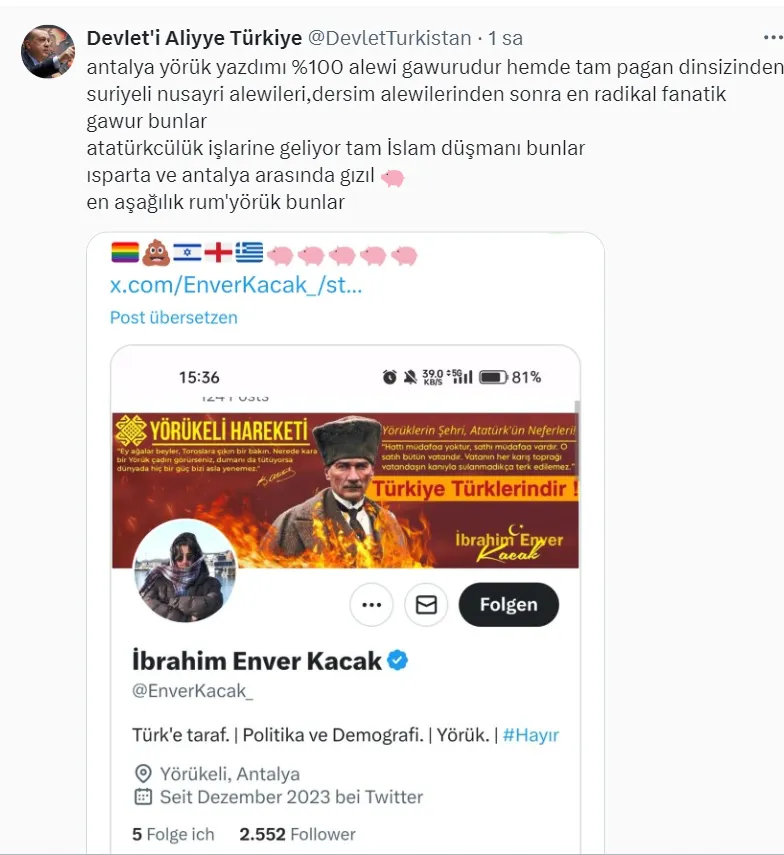 Devlet’i Aliyye Türkiye hesabından, kendisini Antalyalı bir yörük olarak tanıtan İbrahim Enver Kacak’ın profili paylaşılarak, bozuk bir Türkçe kullanılıp şu çirkin ifadelere yer verildi: