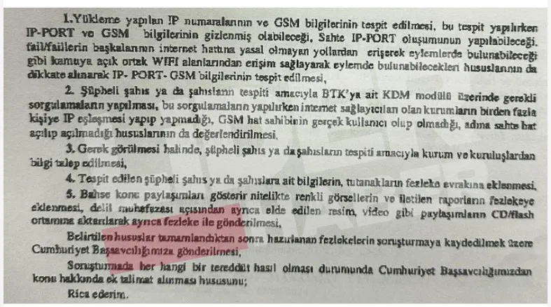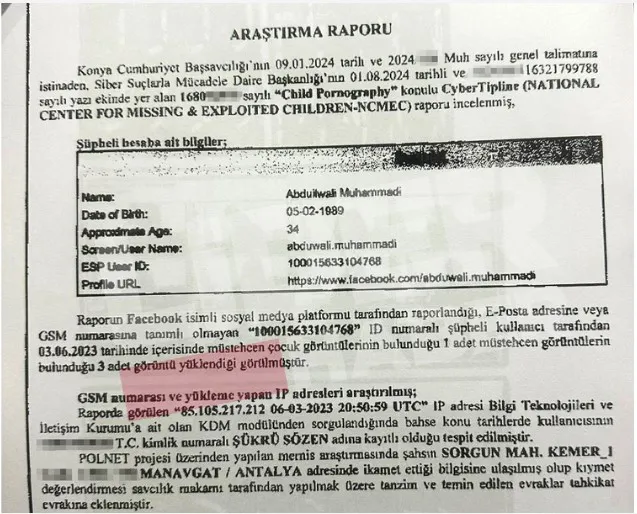 Ulusal Kayıp ve İstismara Uğrayan Çocuklar Merkezi (NCMEC) tarafından hazırlanan ve Türkiye’ye resmi kanallardan iletilen rapor, 3 Haziran 2023 tarihinde bir sosyal medya hesabı üzerinden “çocuk istismarı içerikli görüntülerin” yüklenmiş olabileceğini bildirdi. Raporun Konya Cumhuriyet Başsavcılığına ulaşmasının ardından Siber Suçlarla Mücadele Şube Müdürlüğü tarafından teknik inceleme başlatıldı. Savcılığın 9 Ocak 2024 tarihli talimat yazısında, söz konusu ihbarın işleme alınması ve “gerçek faile ulaşılabilmesi için kapsamlı teknik araştırma yapılması” talimatı verildi.