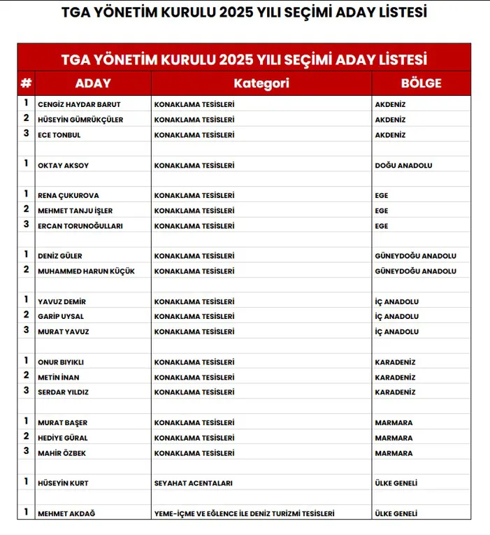 TGA seçimleri için kesinleşen aday listesine göre 12 kişinin seçileceği konaklama tesisleri sektöründe 18 aday çıktı. Akdeniz, Marmara ve Doğu Anadolu dışındaki bölgelerde yarış olacak. Akdeniz'den seçilecek 3 isim için 3 aday bulunuyor ve bu adaylar Cengiz Haydar Barut, Hüseyin Gümrükçüler ve Ece Tonbul oldu. Marmara'dan seçilecek 3 isim için Murat Başer, Hediye Güral ve Mahir Özbek aday oldu. 2 kişi seçilecek Ege'den Rena Çukurova, Mehmet Tanju İşler ve Ercan Torunoğulları yarışacak. 1 kişi seçilecek Güneydoğu Anadolu'dan Deniz Güler ve Muhammed Harun Küçük aday oldu. 2 kişi seçilecek İç Anadolu'daki 3 aday Yavuz Demir, Garip Uysal ve Murat Yavuz oldu. 2 kişi seçilecek Karadeniz'de Onur Bıyıklı, Metin İnan ve Serdar Yıldız, 1 kişinin seçileceği Doğu Anadolu'da ise tek aday Oktay Aksoy bulunuyor.