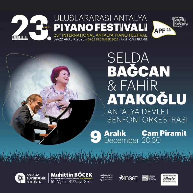 Antalya Büyükşehir Belediyesi’nin en önemli sanat etkinliklerinden biri olan 23. Antalya Piyano Festivali, Cam Piramit’te Antalya Devlet Senfoni Orkestrası eşliğinde Fahir Atakoğlu & Selda Bağcan konseri ile başlıyor.