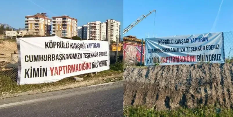 Köprülü kavşak çalışmaları için Cumhurbaşkanı Erdoğan’a teşekkür edilen kavşaklara asılan pankartlardaki “Kimin Yaptırmadığını Biliyoruz” diyerek gönderme yapıldı.