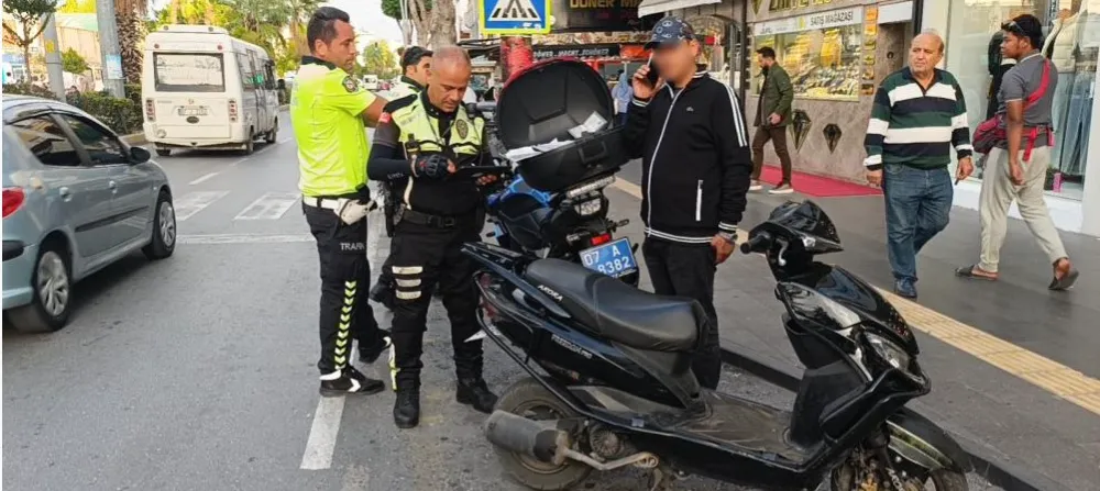 Antalya'nın Manavgat ilçesinde motosiklet sürücüsü yayalara yol vermek için duran otomobile arkadan çarptı. Kazada sürücü belgesi bulunmayan ve katlanır plaka kullanan sürücü ile motosiklet sahibine toplan 41 bin 163 TL para cezası uygulandı.